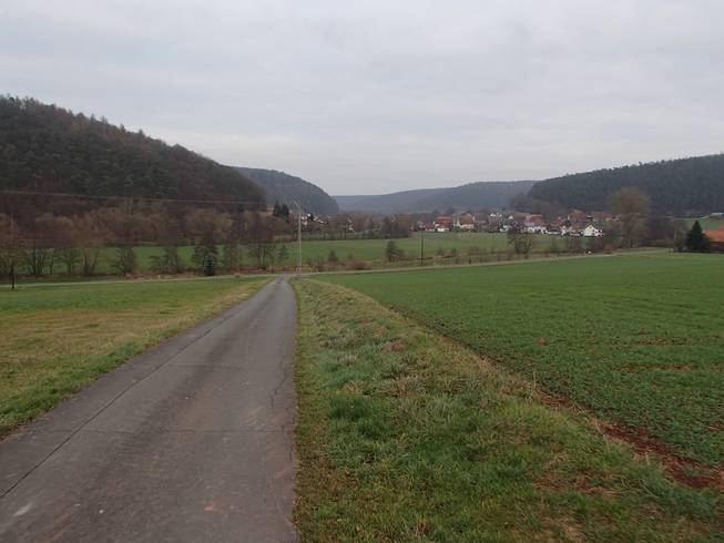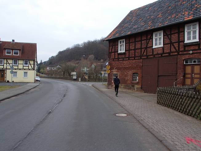 Braunsen 14.47 Uhr / Km 37,4 Und der Blick direkt nach Braunsen. Noch so eine elende Passage bergab. Hier ging ich. Warum ich hier hinunter gehen und nicht laufen konnte nachdem es bei Km 34,5 bis 37 genau anderes herum war? Keine Ahnung. Lag wohl am Asphalt. |