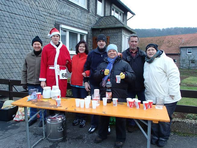 Braunsen 14.54 Uhr / Km 38,7 Gruppenfoto mit Nikolaus. Für das Foto wurde extra eine Läuferin angehalten. Es hatte halt keiner mehr eilig. |
