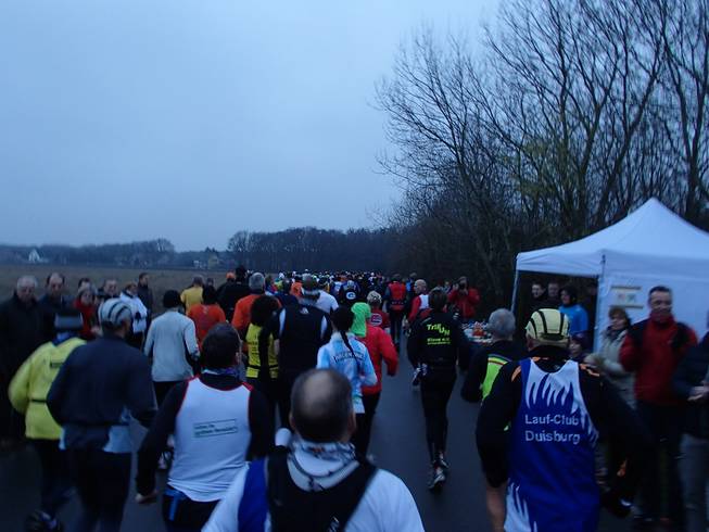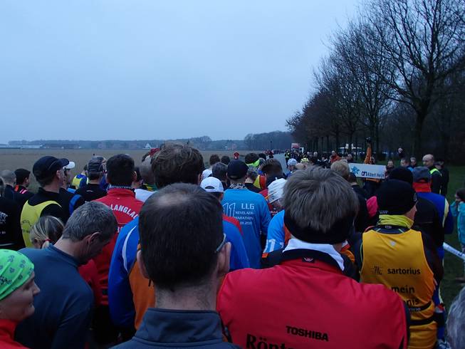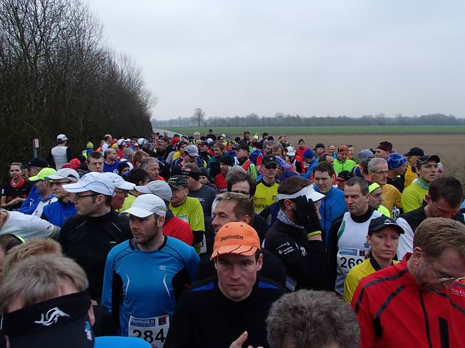 Beetenackerweg 9.53 Uhr Also schnell in die Menge kuscheln. 400 Läufer war das frühere Teilnehmerlimit gewesen. Weil das zu wenig wurde, zog man nach Twisteden um. Nun hatte man zwar 414 Anmeldungen, aber nur etwas mehr als 300 Läufer am Start. |