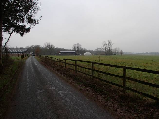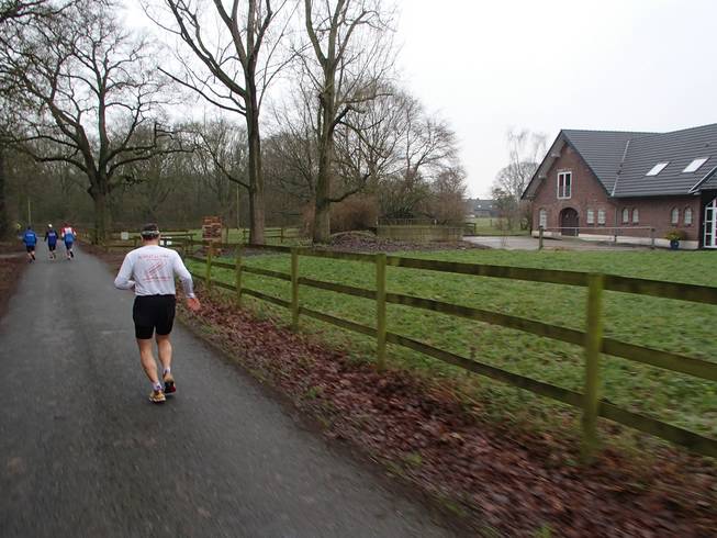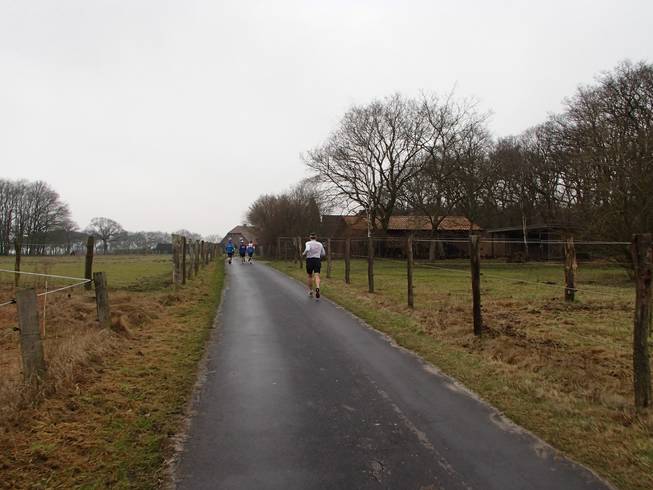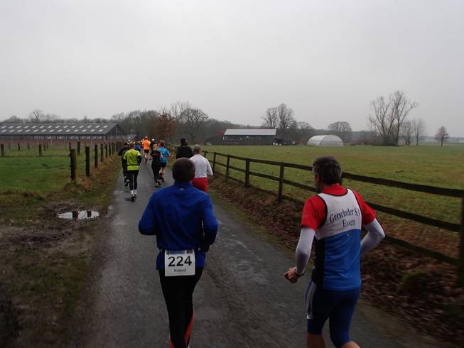 Im Kuckucksfeld Runde 1 Km 2,5 / 10.14 Uhr Sonderlich spektakulär ist der Kurs nicht. Viel Felder und Wiesen, etwas Wald, ein paar Höfe und kleine Siedlungen. Gegenüber der alten Strecke durchaus eine Steigerung, was aber auch nicht so schwer war. Das triste Wetter paßte ganz gut zur Landschaft. |