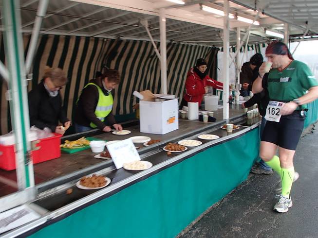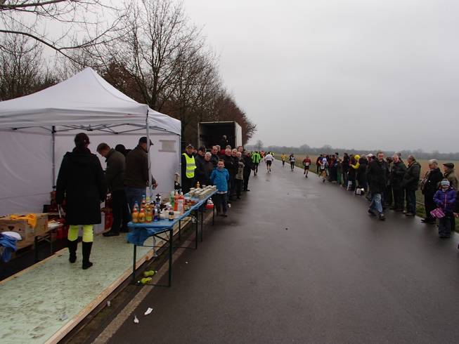 Am Bollenberg Runde 2 Km 9,5 / 10.52 Uhr Zwei Verpflegungsstellen gab es an der Strecke. Eine bei Start und Ziel und die zweite hier knapp hinter der Hälfte. Während es bei Start und Ziel nur Getränke gab, wurde hier richtig etwas geboten. Warmen Tee, Wasser, Iso, Cola, Obst und natürlich auch Honigkuchen. |