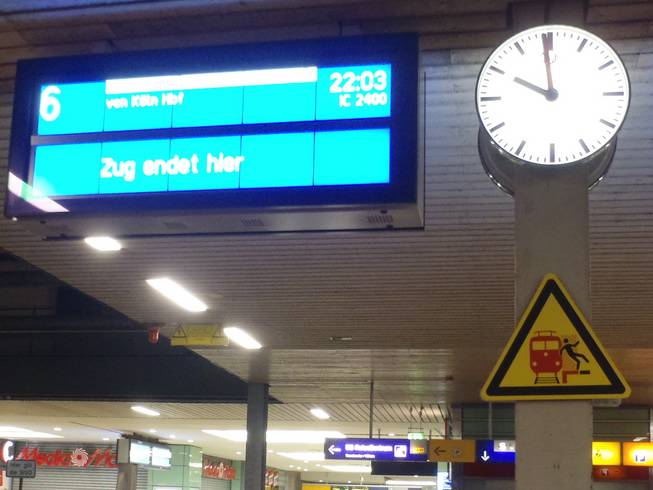 Bahnhof Hamburg-Altona 21.59 Uhr Und noch etwas Besonderes zum Schluß. Auf der Rück-fahrt nach Hamburg kam mein Zug ZU FRÜH (!!) an. Das ist zwar ungünstig, wenn man noch einen Film zu Ende gucken will, aber besser als um diese Zeit auch noch Verspätungen zu haben. Immerhin muß ich Montag früh um 4.25 Uhr wieder aufstehen. |