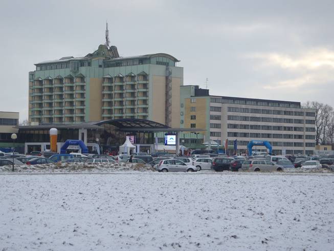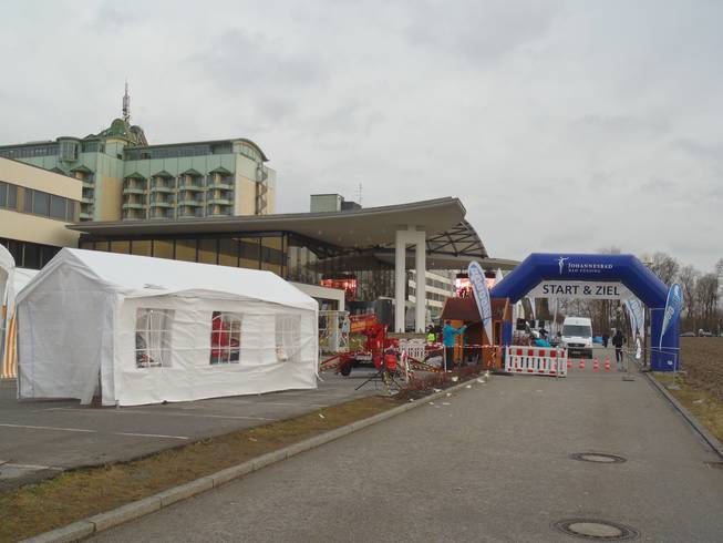 Bad Füssing Johannesbad 9.57 Uhr Nachdem ich meine Sachen losgeworden war und die so groß angekündigte neue Toilettenanlage (beheizt!!) neben dem Haupteingang getestet hatte (eine irre lange Warteschlage von ZWEI Läufern), kam auch ich in der Startaufstellung an. |