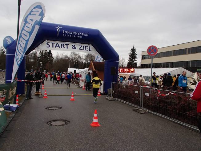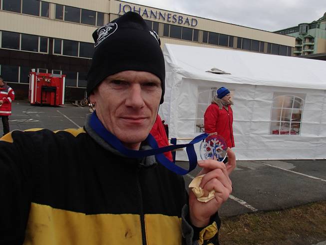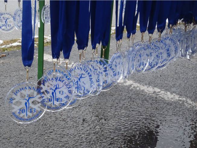 Bad Füssing Johannesbad 9.31 Uhr Da warteten schon die Medaillen auf Finisher. Sehr schöne Medaillen mit Schneekristall-Gravur. Eine davon wollte ich auch haben. |