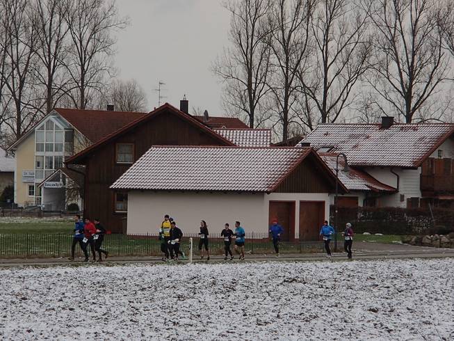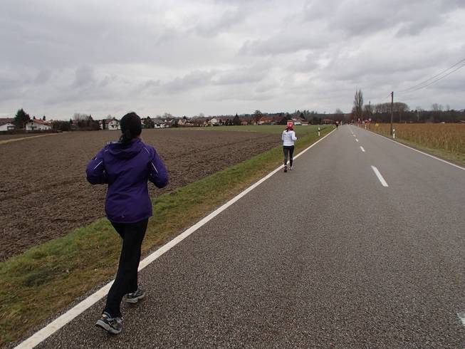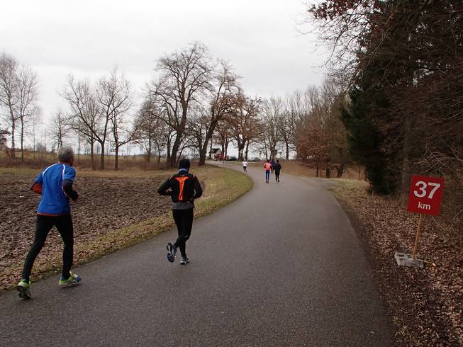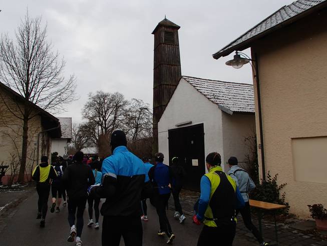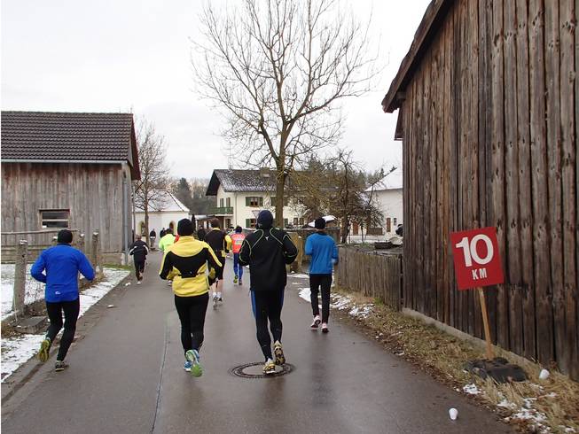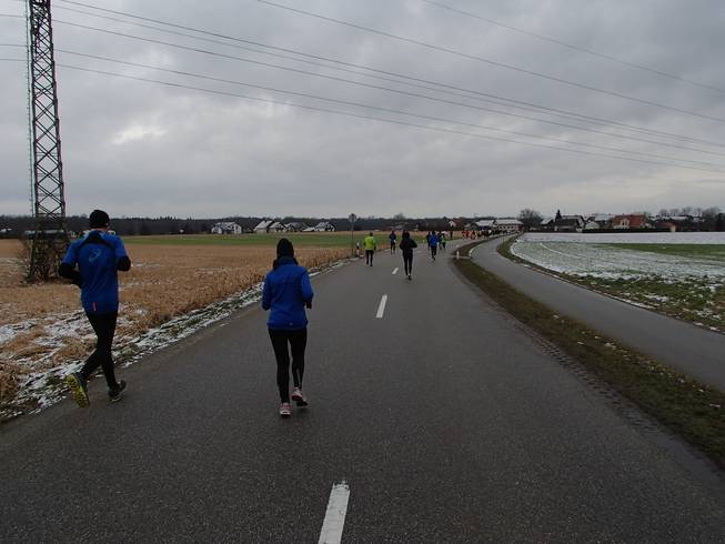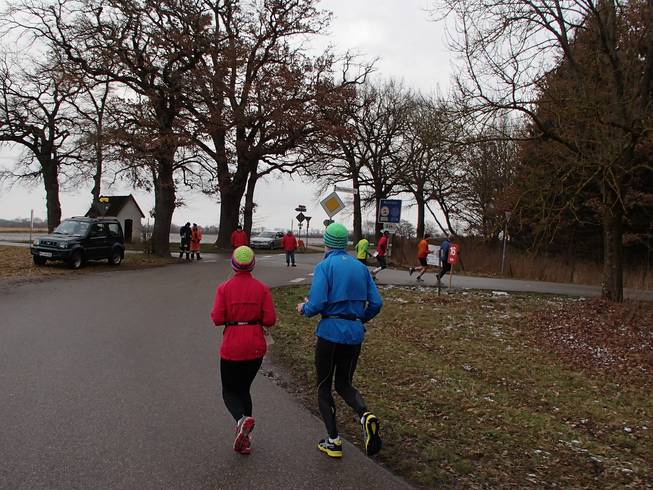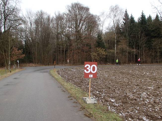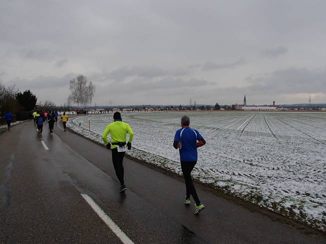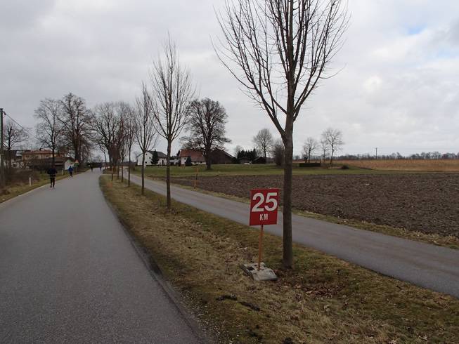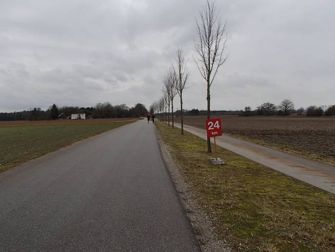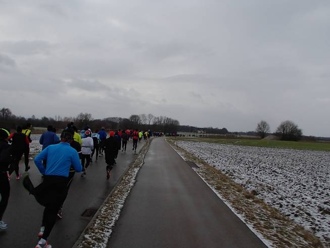 Thierham Km 25,0 / 12.15 Uhr Wie man sieht, viele andere Läufer sieht man nicht. Ich lief ruhig und locker und versuchte den Gegenwind zu ignorieren. Immerhin froren mir die Finger jetzt nicht mehr ein. Es war auch etwas wärmer geworden. Der Schnee auf den Feldern war fast ganz weggetaut. |