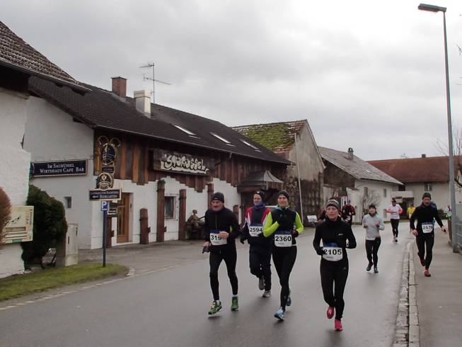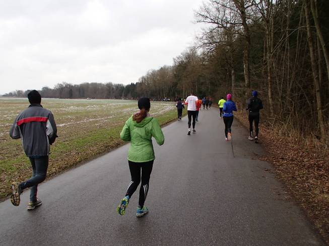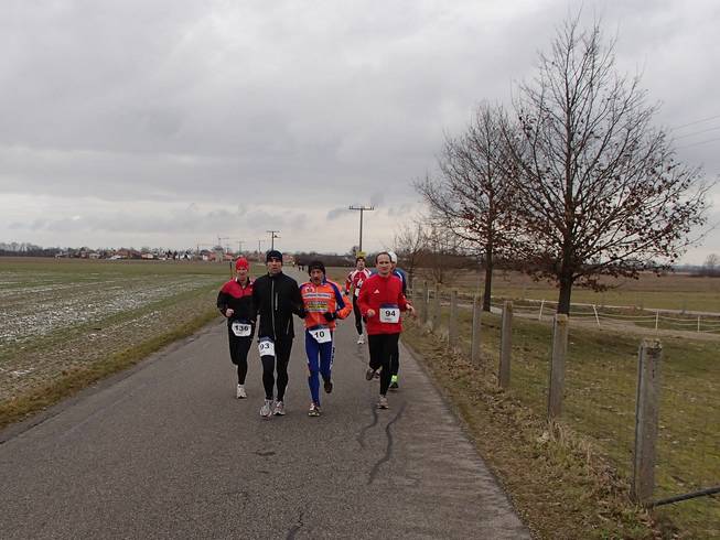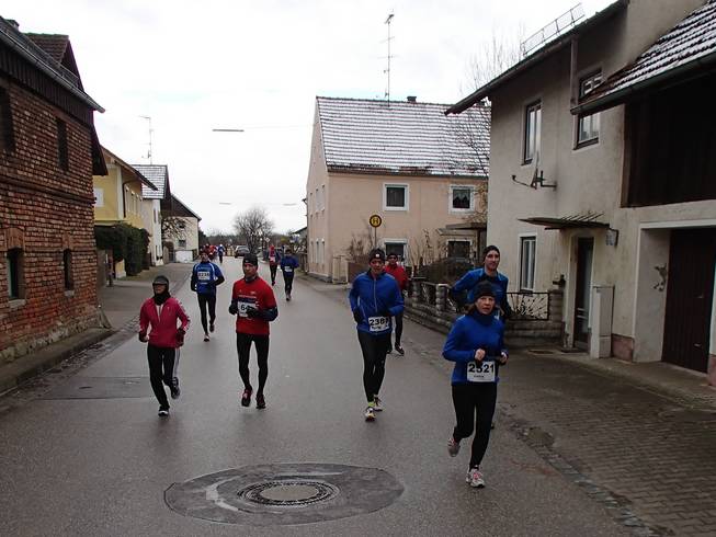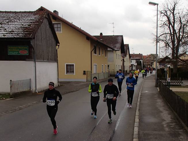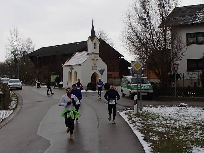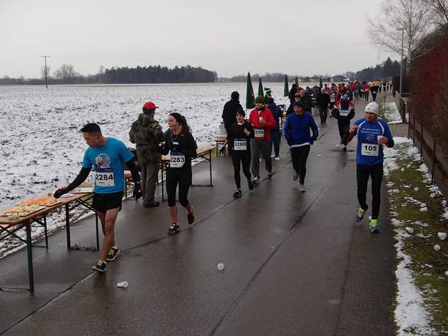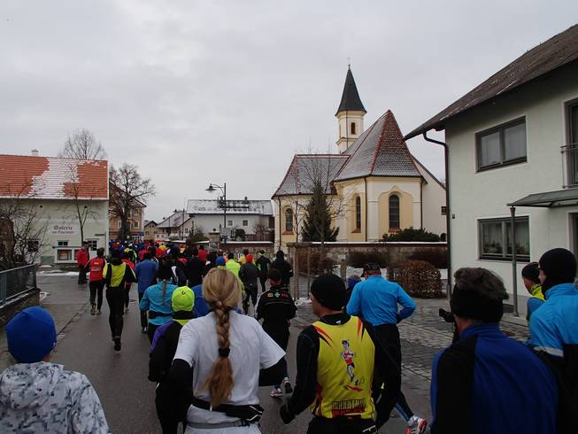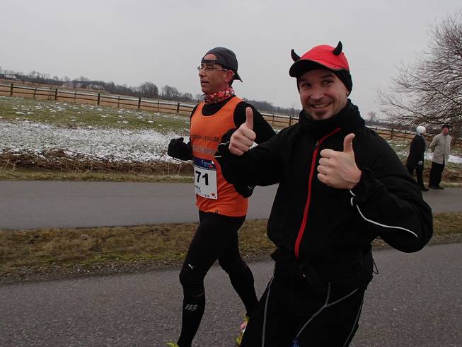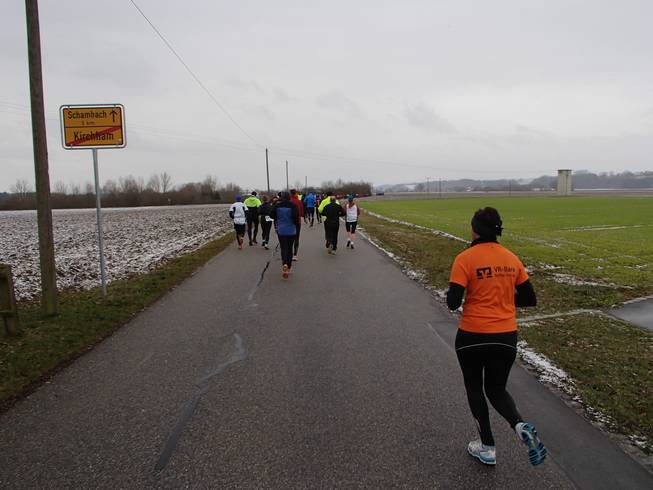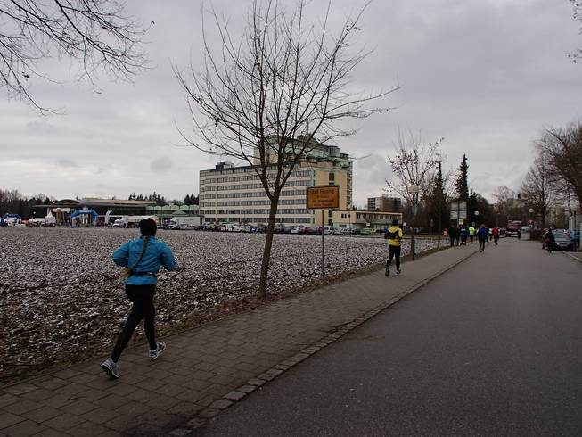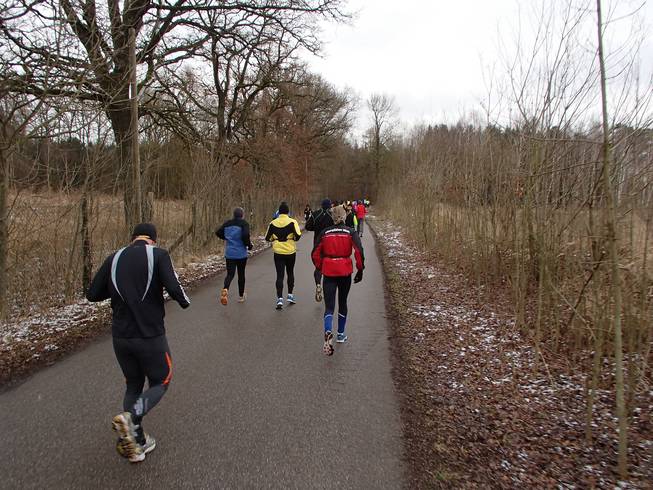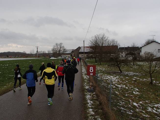 Thierham Km 25,0 / 12.15 Uhr Wie man sieht, viele andere Läufer sieht man nicht. Ich lief ruhig und locker und versuchte den Gegenwind zu ignorieren. Immerhin froren mir die Finger jetzt nicht mehr ein. Es war auch etwas wärmer geworden. Der Schnee auf den Feldern war fast ganz weggetaut. |