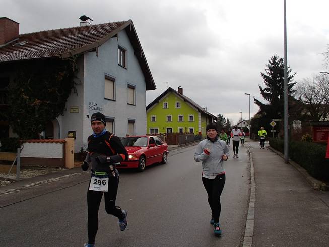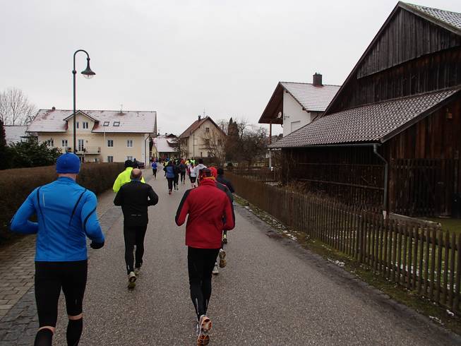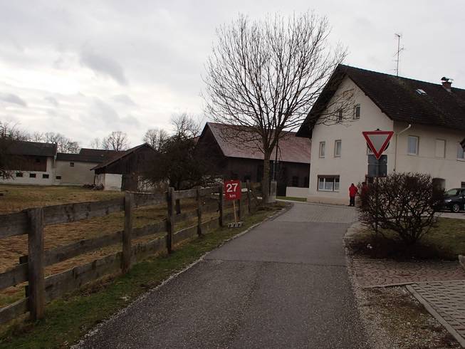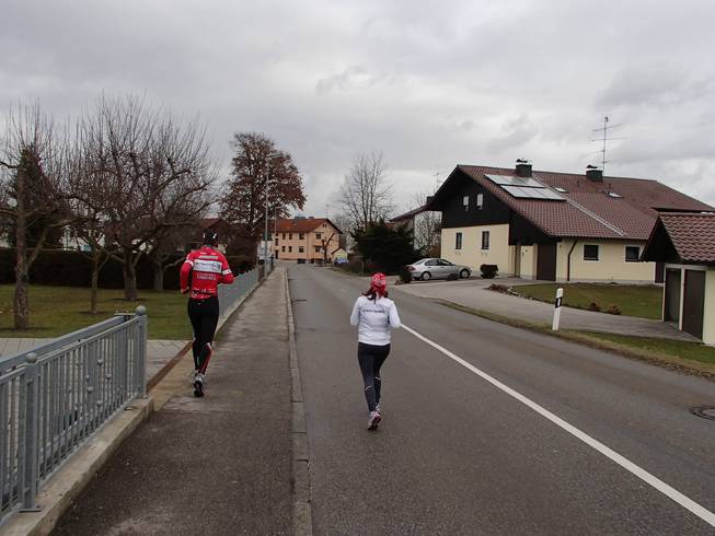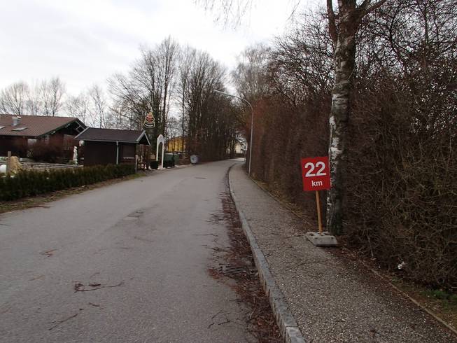 Thierham / PA60 Km 4,0 / 10.22 Uhr Es ging über freies Feld und an ein paar Siedlungen vorbei. Der Weg ist durch-gehend asphaltiert und war eis- und schneefrei. Also vom Wind abgesehen gute Laufbedingungen bei um die 0°C. |