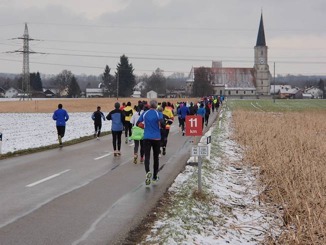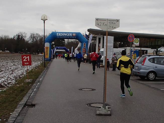 Inntalstraße Riedenburg / Bad Füssing Km 20,8 / 11.52 Uhr Johannesbad voraus. Auf den letzten Metern der ersten Runde ließ ich mich noch von ein paar Halb-marathonläufern ziehen, die nun schon ins Ziel und dann ins Warme liefen. |