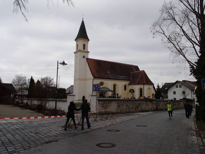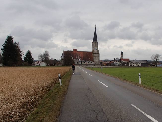 Obere Inntalstraße / PA59 Egglfing am Inn Km 18,2 / 11.38 Uhr Verpflegungspunkt Nr. 4. Und die Pfarrkirche in Hintergrund. |