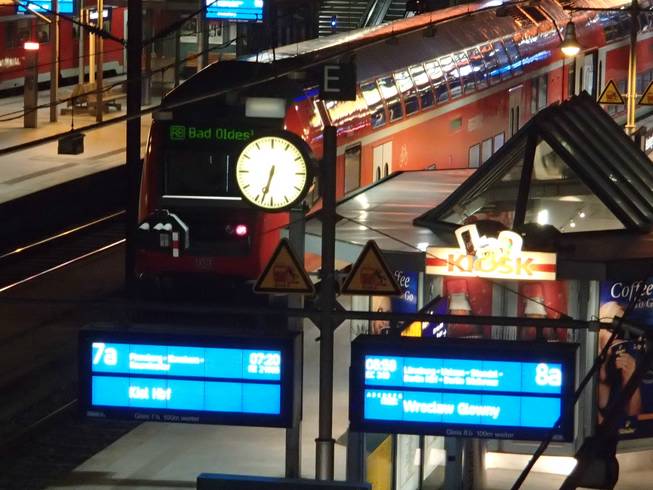 Hamburg-Hauptbahnhof, 6.34 Uhr Na, in welche Marathon-Hölle fahre ich denn heute? Links Kiel oder rechts nach Wrocław (Polen)? Die Entscheidung war dann nicht so schwer. Denn der Wrocław-Marathon läuft ja erst im September. PS: "Marathon-Hölle" bezieht sich im Fall des Wrocław-Marathon rein auf meine ganz persönlichen Erlebnisse während des Laufes 2012. |