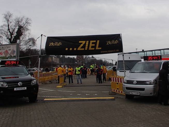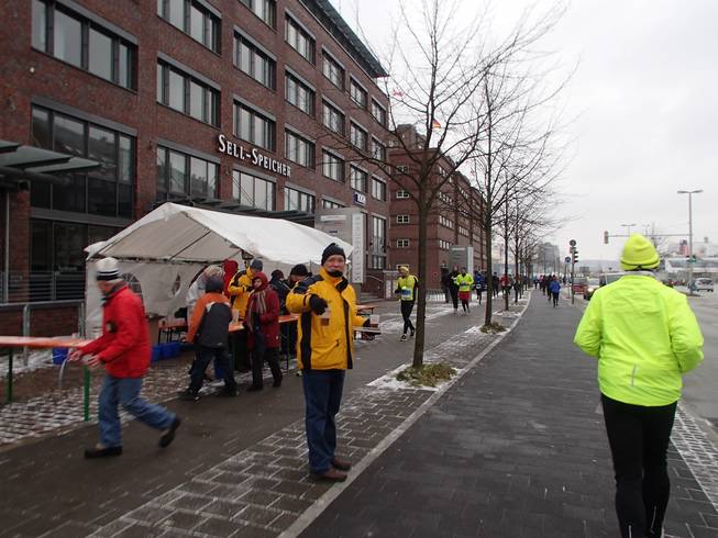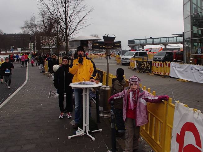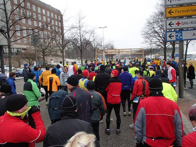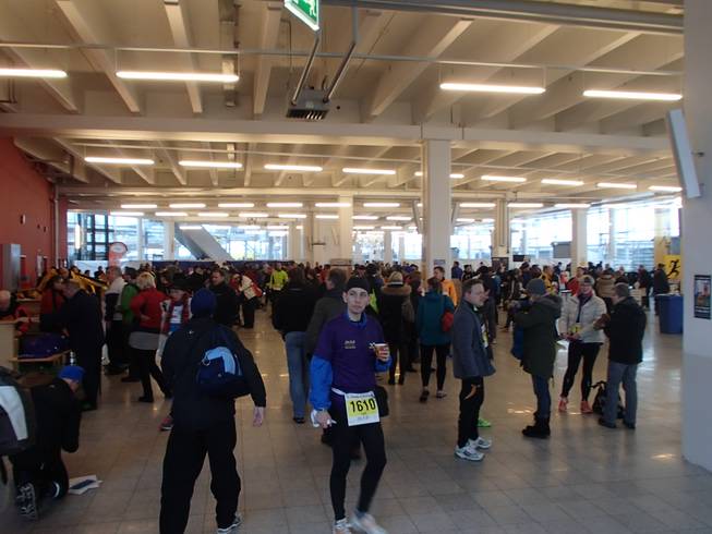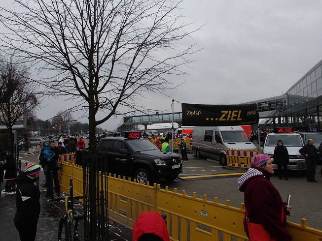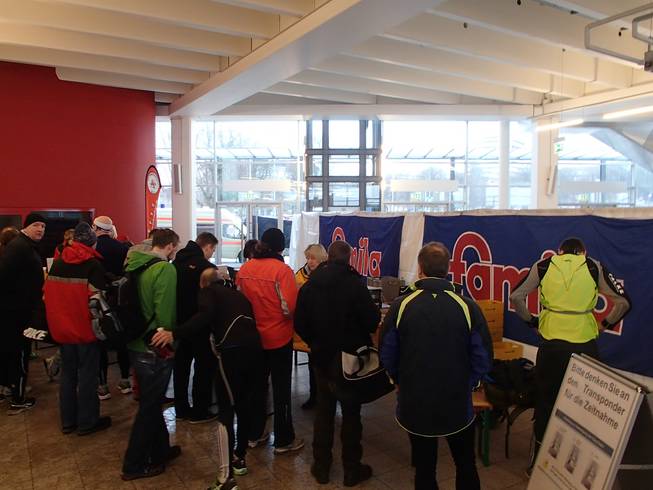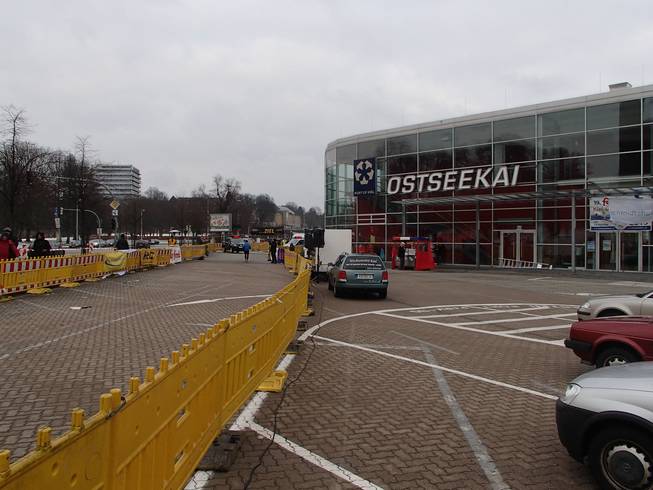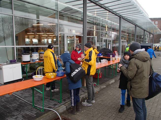 Ostseekai, 14.17 Uhr Rasch an die Verpflegung (nun gab es die Brühe auch in heiß) und dann noch schneller in die warme Halle. Etwas unangenehm: zwar gab es dieses Jahr erstmals eine bewachte Kleider-abgabe. Die Sache lagerten aber in einem ungeheizten Bereich und waren somit eiskalt. Naja, kann eben nicht alles perfekt sein. |