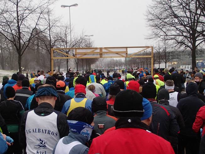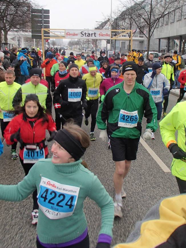 Wall, 10.20 Uhr Und schon ging es los. 240 Marathon-Läufer starteten auf dem Vier-Runden-Kurs entlang der Kieler Förde. Schon um 10.00 Uhr waren 550 Meter nördlich 635 Läufer und 26 Walker auf der 10-Km-Distanz ins Rennen gegangen. Um 11.15 Uhr sollten noch 590 Halbmarathon-Läufer folgen. Macht insgesamt also 1491 Läufer in Kiel. |