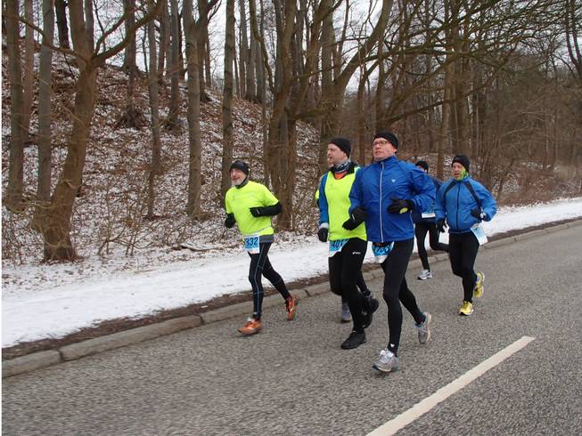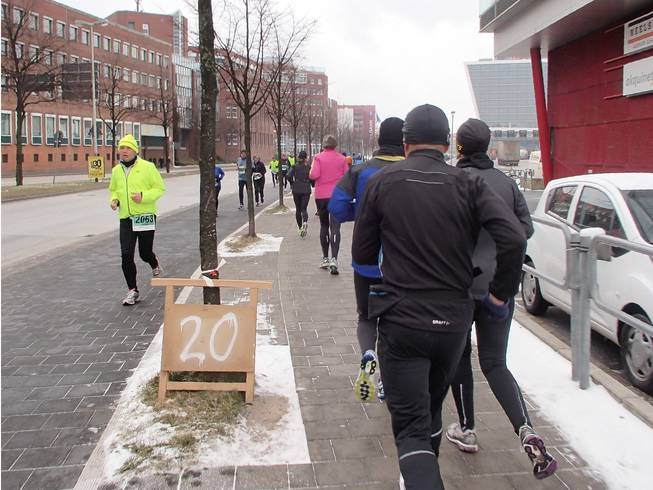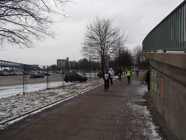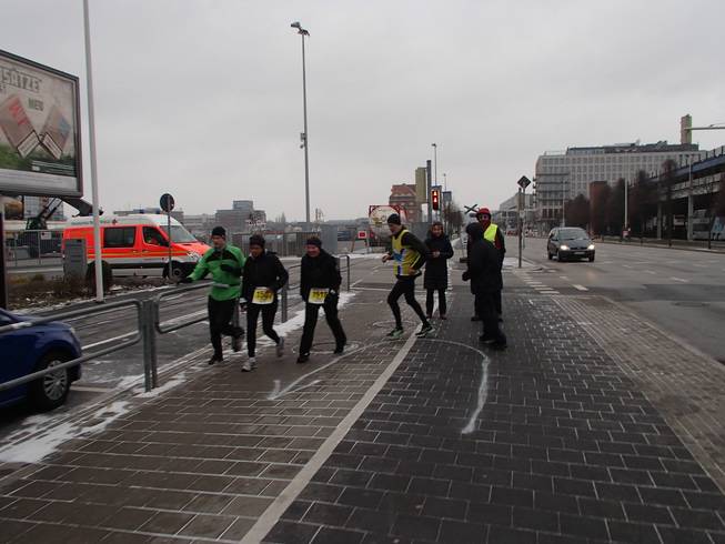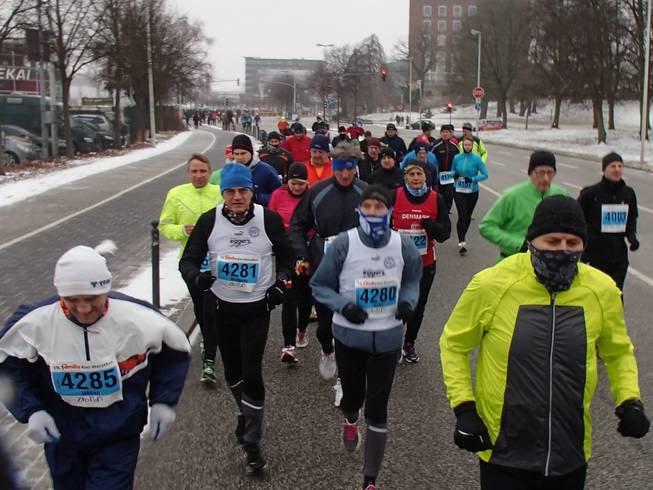 Düsternbrooker Weg / Runde 1 10.22 Uhr / Km 0,3 Ein Vermummungsverbot gibt es für Marathon-Läufer wohl nicht. Zum Glück nicht, denn von Beginn an ging es direkt gegen den Wind und den Schnee und beides war kalt, kalt, kalt. |