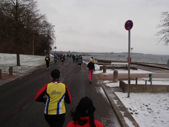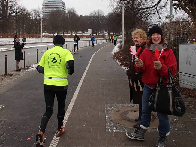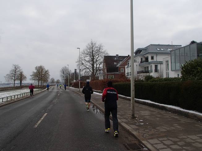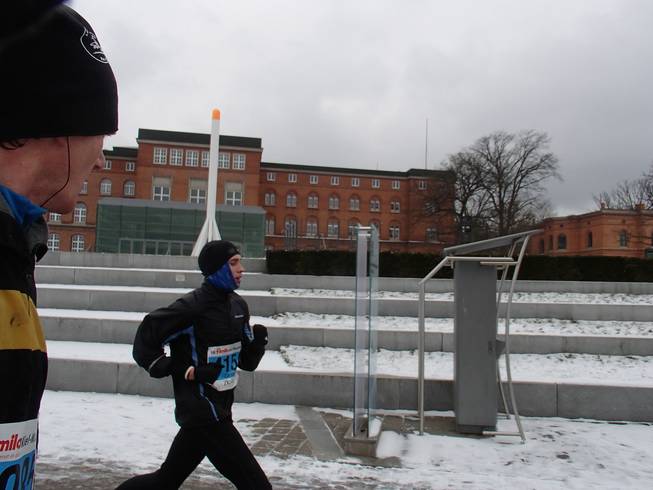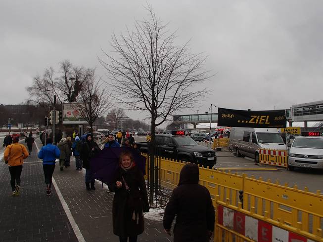 Hindenburgufer / Runde 2 11.37 Uhr / Km 13,5 Eine total mißlungenen Pinkelpause später (wieso ist es bloß so schwer, bei Null Grad einen blöden Knoten zu binden???), holte ich wie erwartet die ersten, d.h. letzten Halbmarathon-läufer ein. |
