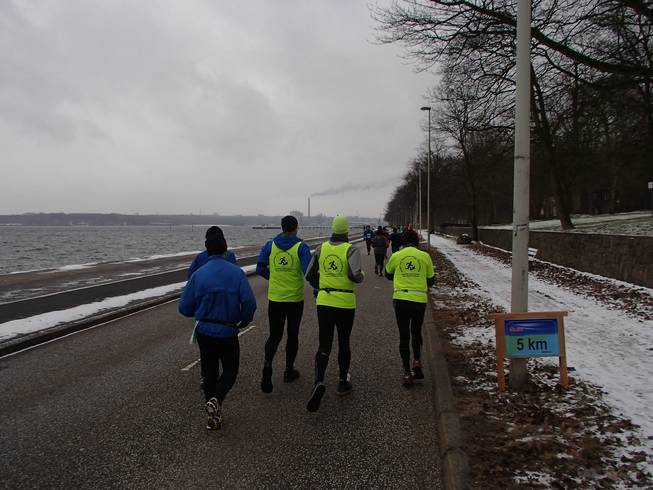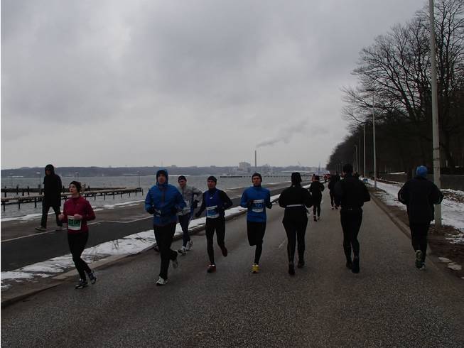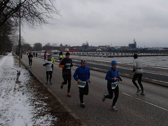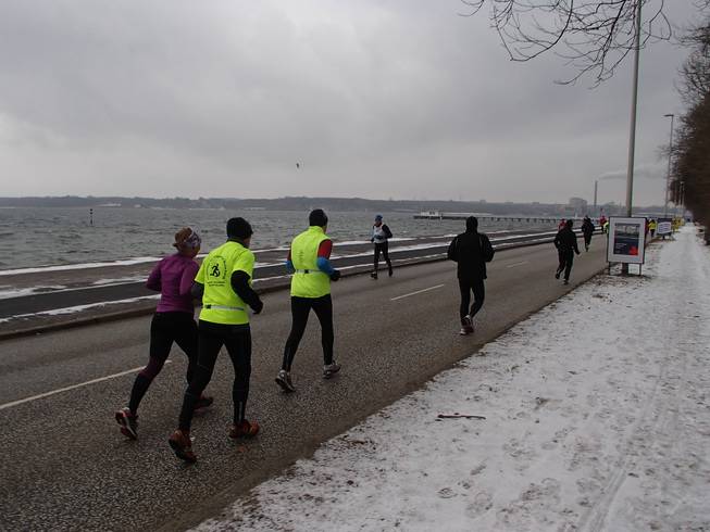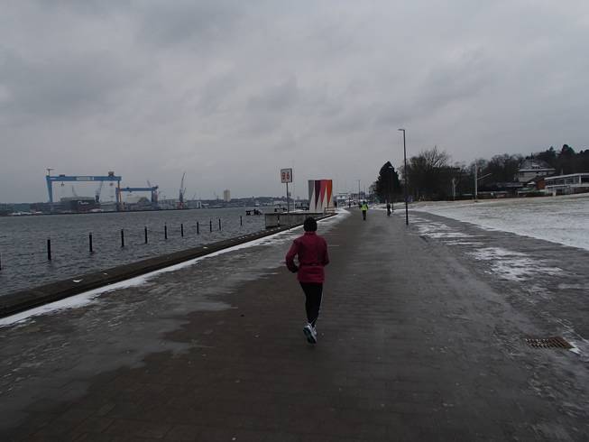 Kiellinie / Runde 1 10.25 Uhr / Km 0,8 Und als es kurz danach direkt an die Kieler Förde ging, wurde es mit dem Wind noch etwas heftiger. Zumal der Nord-Ost-Wind ungehindert über das Wasser angepfiffen kommen konnte. |