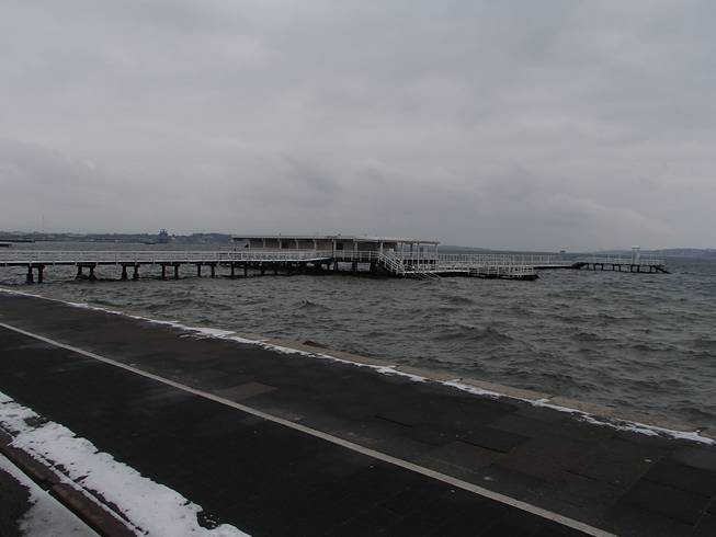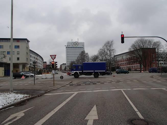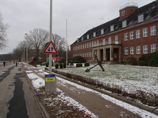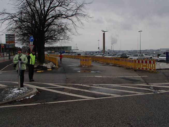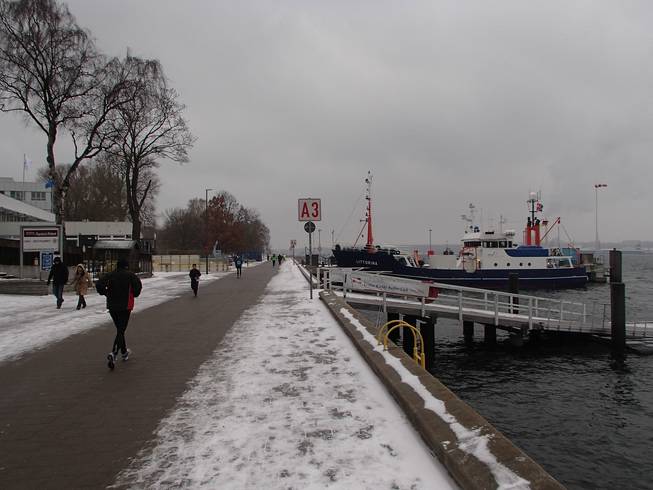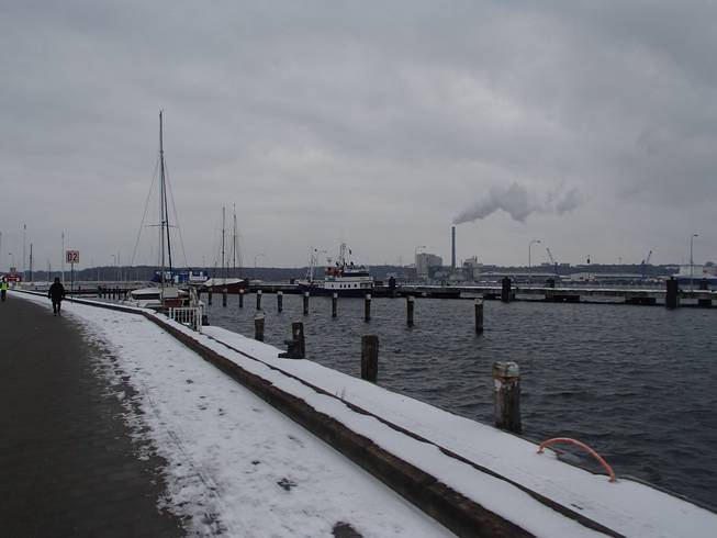 Kiel / Kaistraße, 9.07 Uhr Ja, es war sehr windig in Kiel an jenem Tag. Wind aus Nord-Ost mit 40 Km/h, später mehr. Temperaturen um den Gefrierpunkt und leichter Schneefall. Der Marsch vom Hauptbahnhof zum Ostseekai war gegen den Wind ganz schön heftig. Und hier sollte ich nachher noch laufen. |