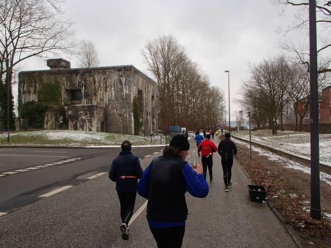 Hindenburgufer / Runde 3 12.43 Uhr / Km 25,4 Zum dritten Male hatte ich den nördlichen Wendepunkt erreicht und befand mich hier am Bunker schon wieder auf dem Weg zurück nach Süden. Hier gab es jetzt Brühe am Verpflegungsstand. Sehr lecker, aber wenn der Tee immer heiß ist, erwartet man das von der Brühe auch, was bei kalter Brühe zu einer interessanten Überraschung führt. |