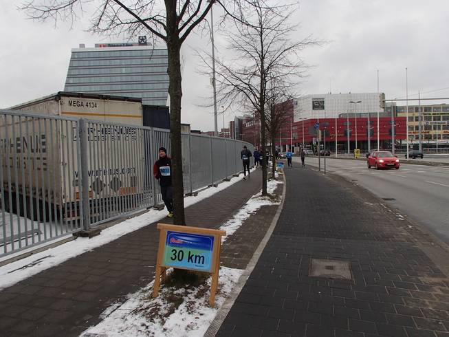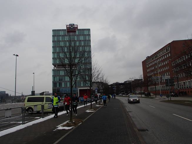 Kaistraße / Runde 3 13.11 Uhr / Km 30,2 Und dann hatte ich noch eine Runde mit viel Wind zu laufen und ohne die nun alle finishenden Halbmarathon-Läufer würde es auf der Strecke leer werden. |