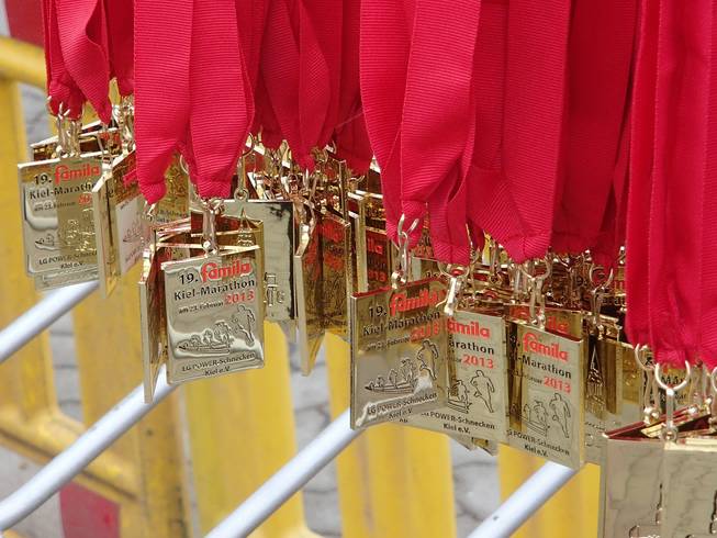 Ostseekai, 14.19 Uhr So schöne Medaillen warteten auf weitere Finisher. Kaum zu glauben, daß es früher mal beim Marathon in Kiel keine Medaillen gegeben hat. |