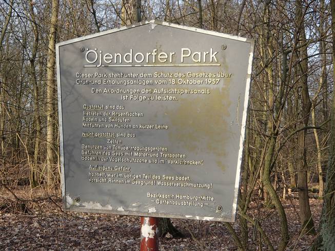 Öjendorfer Park 8.05 Uhr Ich finde es immer wieder erstaunlich, daß im nicht besonders schneereichen Hamburg das Rodeln und Skilaufen so ausdrücklich erlaubt wird. Von Laufen steht da nichts. Der Punkt "Mitführen von Hunden an kurzer Leine" könnte noch etwas größer geschrieben werden. |