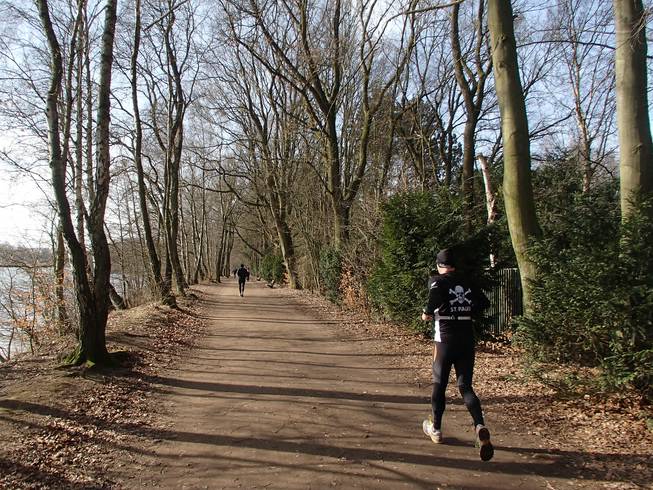 Runde 1 / Km 0,8 9.12 Uhr Und dann kam auch der Marathon-Pulk in die erste von elf Runden um den Öjendorfer See.