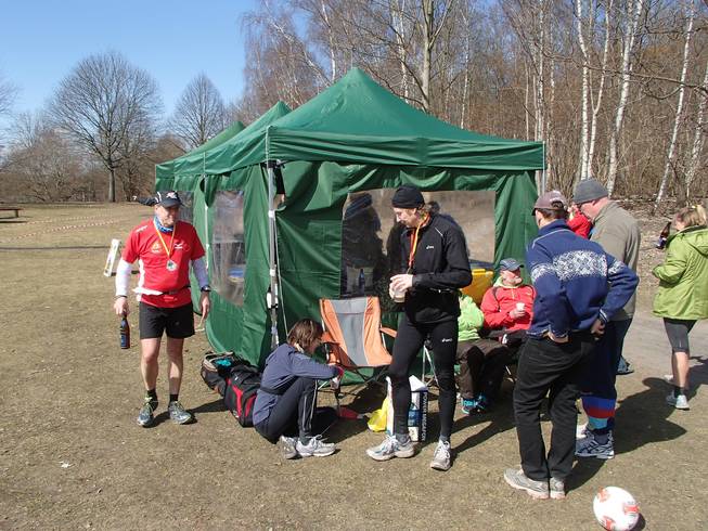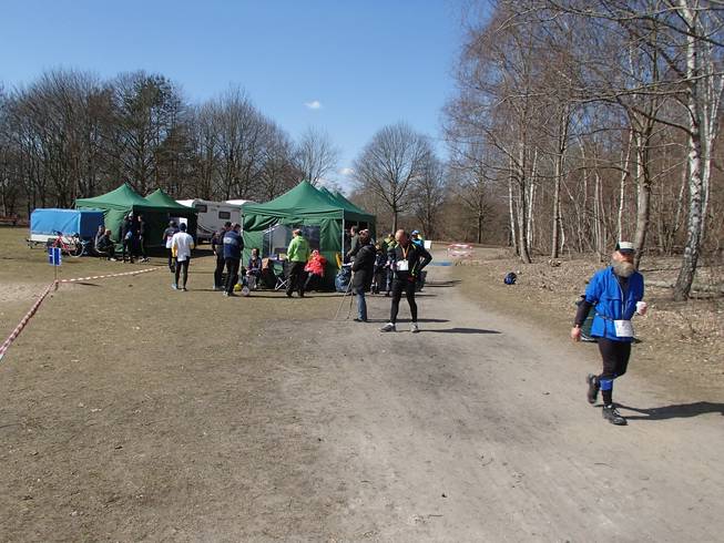 Runde 11 / Km 41,9 13.35 Uhr Laufen geht halt doch in erster Linie mit dem Kopf. Jetzt nur noch links durch den kleinen Wald und die grünen Zelte markierten schon das Ziel. |