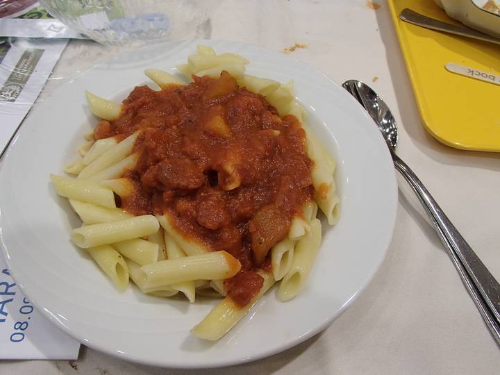 Endurance'13 Hamburg-Messe Eine offizielle Pasta-Party gab es nicht, aber dafür konnte man in der Messe Nudeln kaufen. Der kleine Haufen Nudeln mit Soße kostete € 5,50. Verglichen mit den Preisen der offiziellen Pasta-Partys der Vorjahre ausgesprochen preiswert. Ich holte mir später noch in der Europa-Passage in der Innenstadt eine Portion Nudeln mit Huhn beim Asia-Shop. |