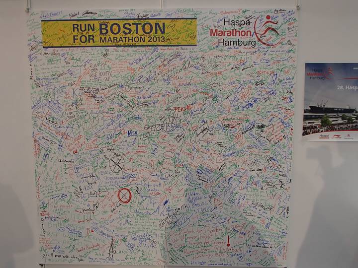 Endurance'13 Hamburg-Messe Eine Wand der Messe war für viele große Tafeln reserviert, an denen man Nachrichten für Boston hinterlassen konnte. |