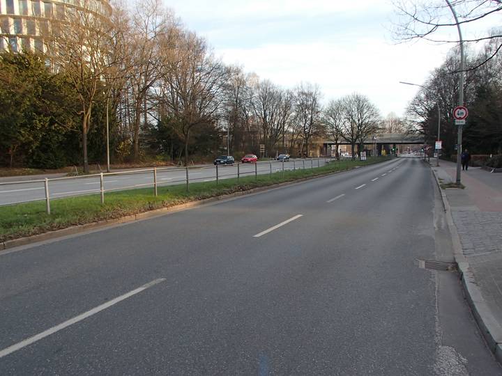 Hindenburgstraße 7.06 Uhr In den letzten Jahren wurde immer auf der linken Seite des Gitters gelaufen. Nun ging es erstmals auf der rechten Straßenseite. Dafür war hier statt Km 26,5 nun schon Km 28,3. Die leicht abgeänderte Strecken-führung machte es möglich. |