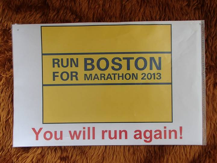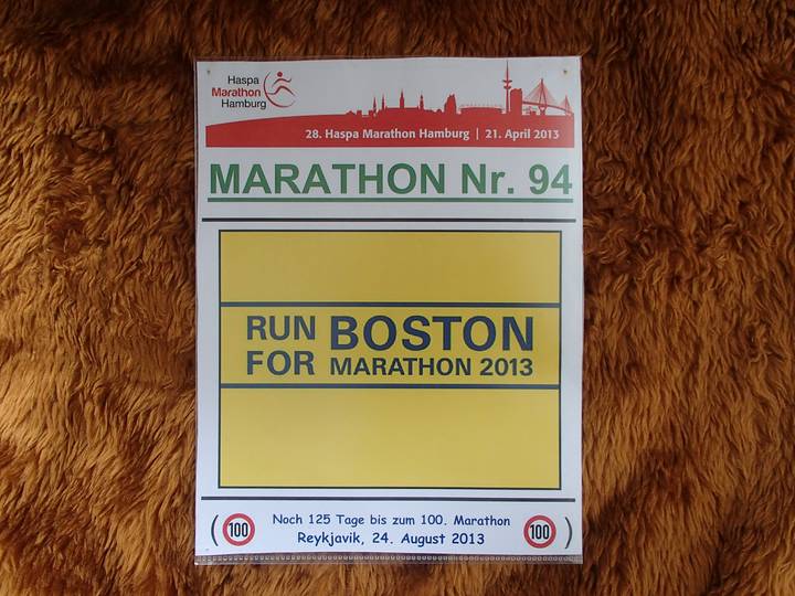 Hamburg-Messe 8.26 Uhr Und dazu auch ein Schild vorne für Boston. "You will run again" waren die Worte von US-Präsident Barack Obama auf der Trauerfeier in Boston am 18. April 2013. Gerichtet an die verletzten Läufer, von denen sich viele noch in Bostoner Kliniken befanden. |