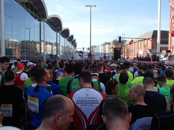 Karolinenstraße / Hamburg-Messe 8.53 Uhr Und geschafft. Nach nur acht Minuten für 100 Meter hatte ich meinen Startblock erreicht. Die Schweigeminute für die Opfer des Terroranschlages auf den Boston-Marathon sowie das Abspielen der Boston-Marathon-Hymne "Sweet Caroline" (Neil Diamond) hatte ich aber verpaßt. |
