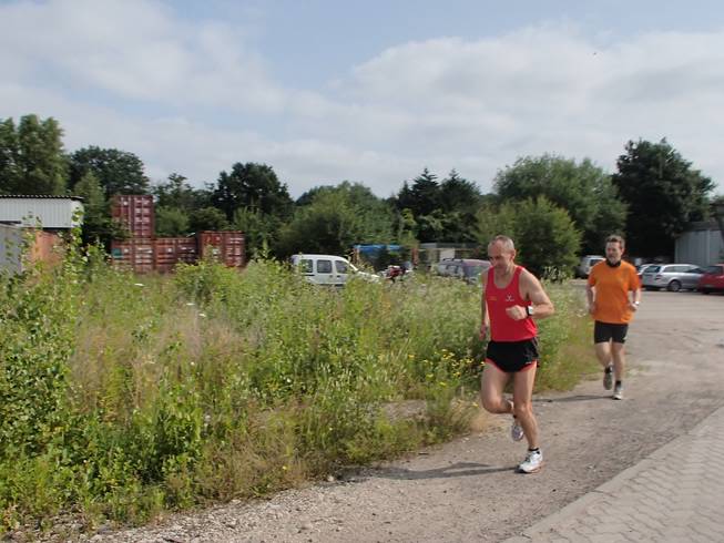 Runde 1 10.14 Uhr / Km 1,5 Bis ein paar Minuten vor dem Start hatte ich eine echte Chance, den Lauf zu gewinnen, aber dann kam Sven und meldete nach. Hier in Rot laufend war er gleich auf und davon. |