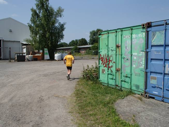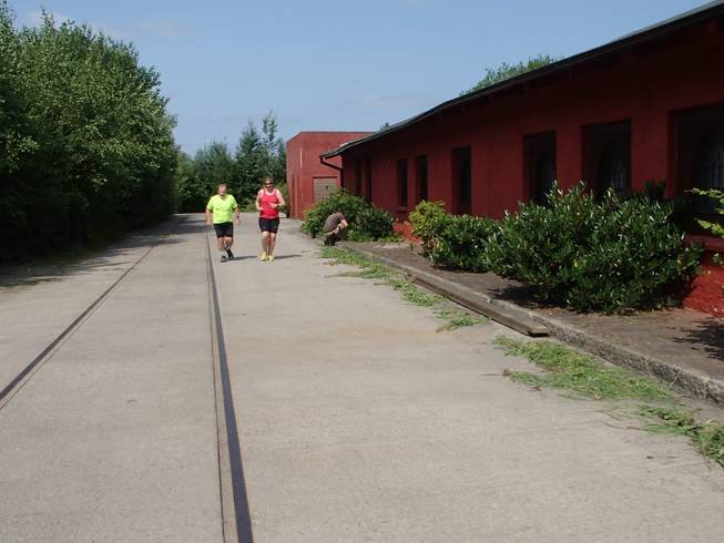 Runde 35 13.58 Uhr / Km 41,1 Und schon war ich in der letzten Runde. Und dank meiner gleichbleibenden Zeiten hatte ich jetzt 7:15 Minuten für die letzte Runde. Das klang mehr als machbar. Noch einmal vorbei am alten Bahnhofsschuppen. |