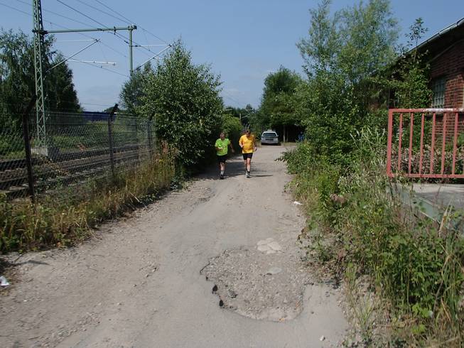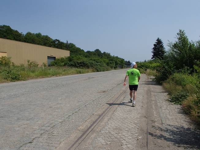 Runde 8 10.56 Uhr / Km 9,0 Ganz ohne Schienen war der Bahnhof doch nicht. Aber schön läuferfreundlich mit Sand ausgefüllt. |