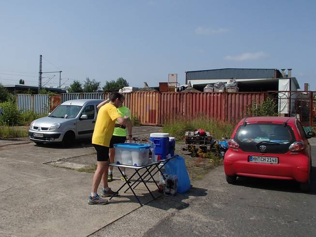 Güterbahnhof Lokstedt Aber am Ende hatten sich bis auf einen Läufer alle pünktlich am Startplatz versammelt. Schnell wurde noch der Verpflegungsstand aufgebaut, es gab eine kleine Einleitung... |