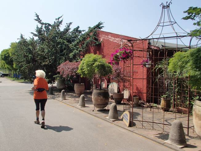 Runde 28 13.11 Uhr / Km 32,8 Der Parkplatz vom Le Marrakesch. Natürlich hatte das Restaurant geöffnet und die Gäste wunderten sich nicht schlecht über die seltsamen Gestalten, die da Runde um Runde in der Hitze auch über den Parkplatz liefen. |