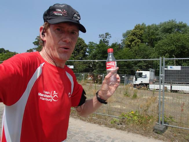 Runde 27 13.08 Uhr / Km 32,3 Aus Angst vor weiterem Sodbrennen stieg ich auf meine eigenen Getränke um. Unter anderem auch eine Flasche Coca-Cola (0,33 Liter), die ich aber nicht an Ort und Stelle in mich hinein kippte, sondern wegen der Kohlensäure auf eine Runde verteilt trank. Das war vielleicht eine Schweinerei. |