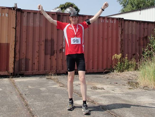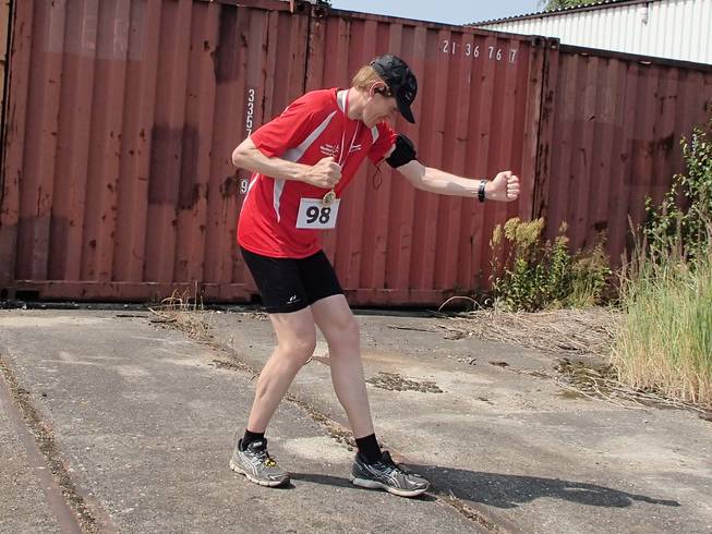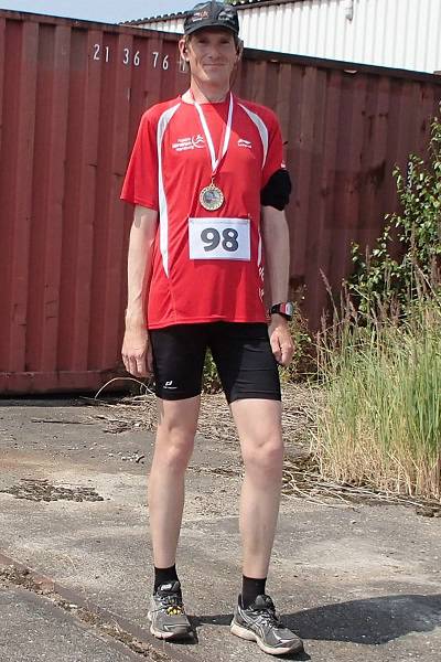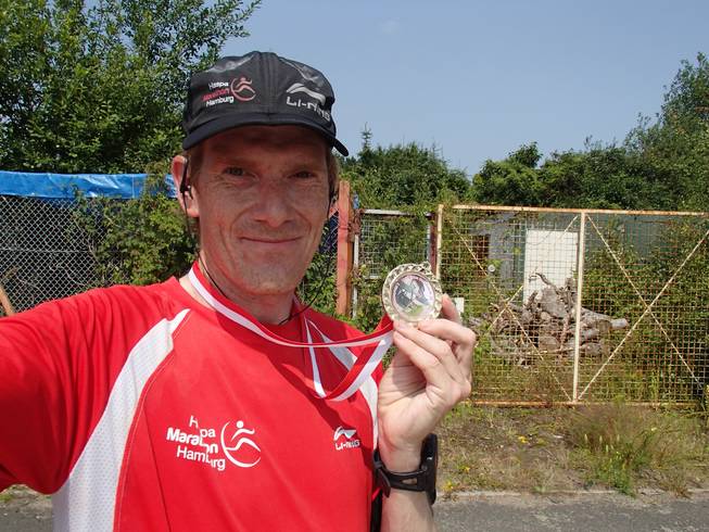 Güterbahnhof Lokstedt 14.10 Uhr Das war genug Grund, ein wenig zu feiern, bevor ich danach in kürzester Zeit alle meine Getränkevorräte in mich hinein kippte. Das war doch sehr heiß. Als Souvenir behielt ich neben der Medaille auch einen Sonnenbrand. Aber nur auf der linken Seite. |
