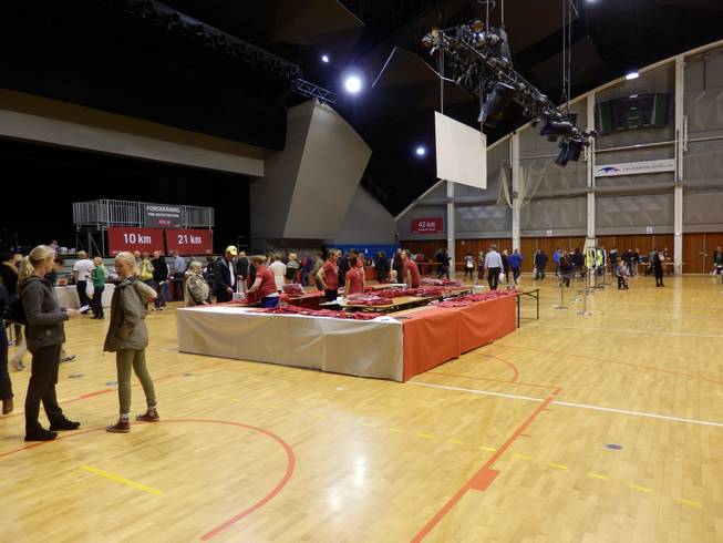 Laugardalshöll Die Startnummernausgabe klappte gut. Auch es etwas Verwirrung gab, daß ich meine Startnummer direkt am Resolution Desk holen wollte. Dahin hatte man mich nämlich per eMail verwiesen, wenn ich mich zu meinem 100. Marathon mit der Startnummer 100 krönen wollte. |