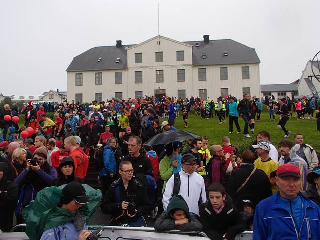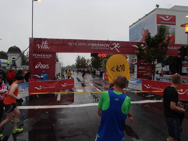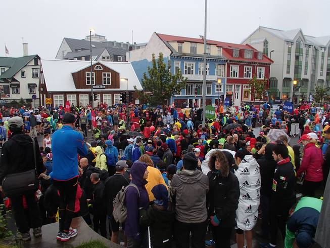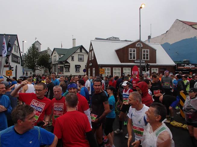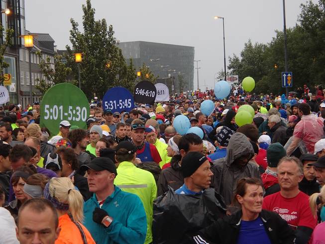 Lækjargata 8.33 Uhr Und wieder das Rätsel um die Startaufstellung. Wieso gab es eigens einen Bereich für Läufer jenseits von 6:11 Stunden, wenn das Zeitlimit doch sechs Stunden ist? Die Mitläufer um mich herum waren auch ratlos bei der Frage. |