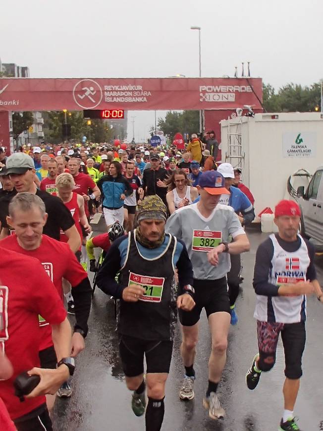 Lækjargata 8.40 Uhr / Km 0,0 Dann kam der Startschuß. Das hatte ja auch eine gefühlte Ewigkeit gedauert. Gerade bei dem naßkühlen Wetter wollte man laufen, um sich warm zu halten. |