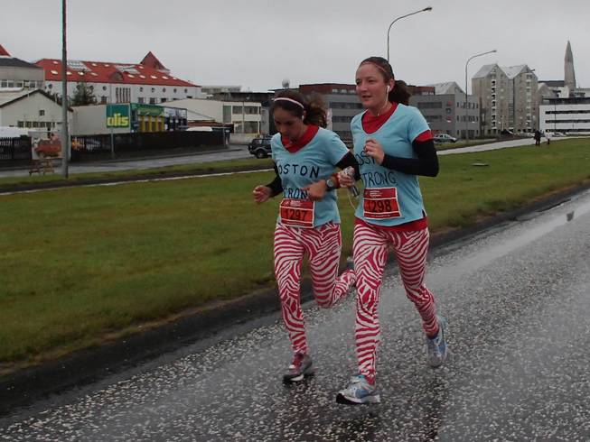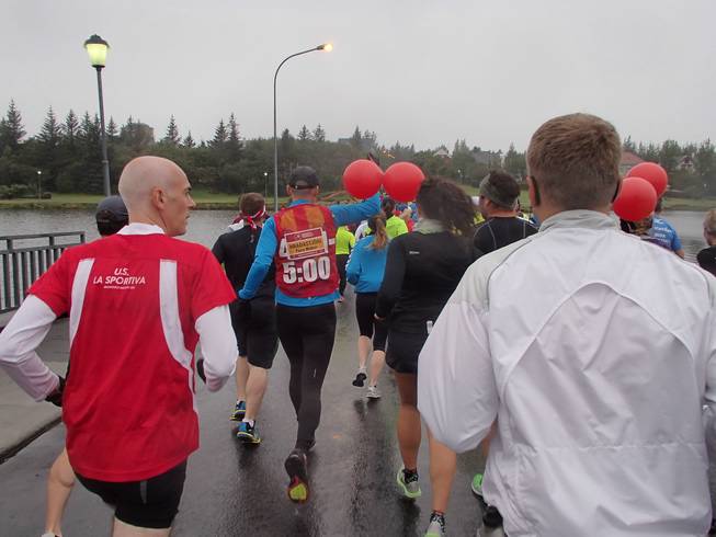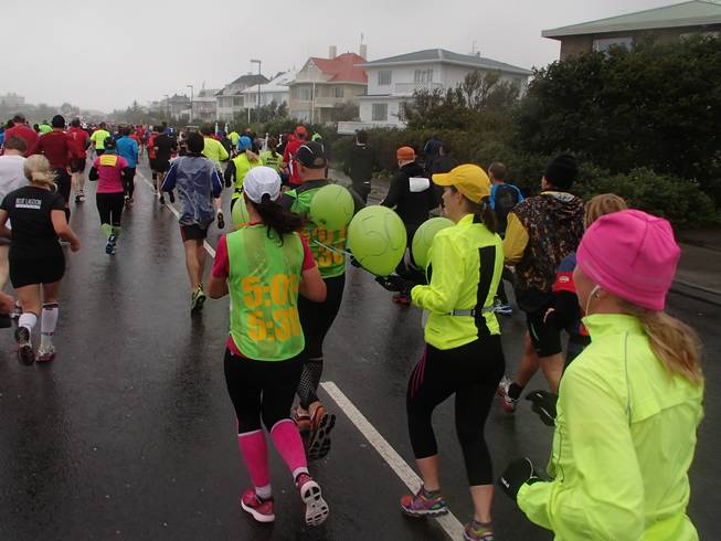 Ægisiđa 8.52 Uhr / Km 2,0 Die 5:00-Stunden-Läufer zogen recht flott an mir vorbei. Das wäre sicher noch etwas schneller über die Bühne gegangen, wenn sich die Ballons nicht verknotet hätten und die beiden Läufer nicht mehr voneinander loskamen.