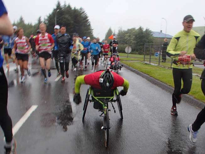 Suđurgata 8.45 Uhr / Km 0,9 Die Rollstuhlfahrer im Feld hatten es schwer. Der Kurs hatte gleich zu Beginn ein paar kleine Steigungen. Bergauf waren die Rollis langsamer als die Läufer, im Flachen schneller. Und das in dem immer noch recht kompakten Feld. Als Läufer macht man natürlich Platz... wenn man denn dann Platz hat. |
