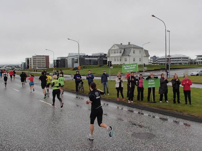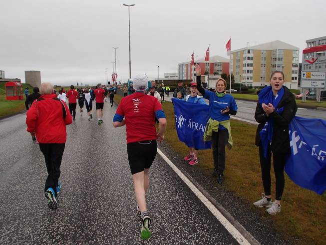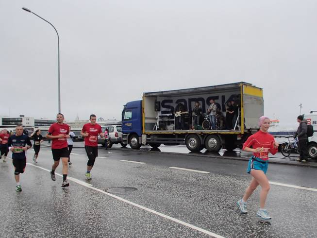 Kalkofnsvegur 9.37 Uhr / Km 10,5 Es gab einige Plätze mit Musik entlang der Strecke. Das entschädigte ein wenig dafür, daß bei dem Wetter recht wenige Leute an der Strecke standen. |