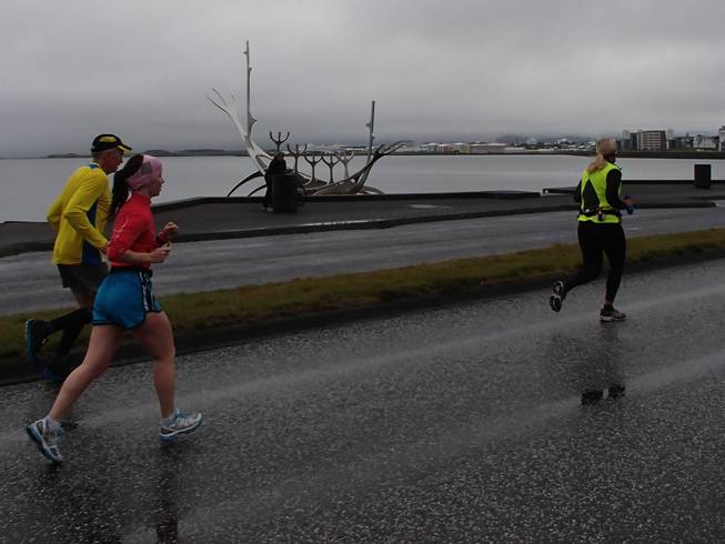 Sæbraut 9.40 Uhr / Km 11,0 Das stilistische Metallschiff links der Strecke ist die Skulptur "Sólfar", was übersetzt "Sonnenfahrt" bedeutet. |
