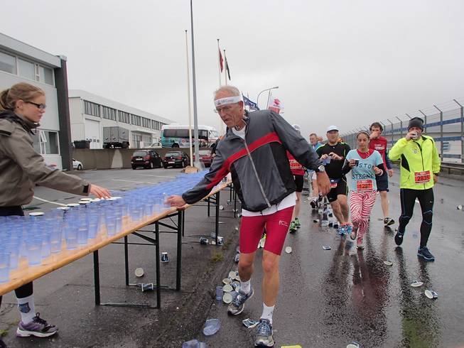 Vatnagarđar 10.04 Uhr / Km 15,5 Verpflegung gab es alle fünf Kilometer. Wasser und Iso. Für das Wetter reicht das. |