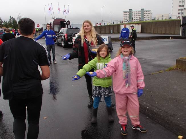 Vatnagarđar 10.06 Uhr / Km 15,9 Vorsicht. Kinder bitte nicht abklatschen. Die haben Bananen in der Hand. Das gibt nur Schweinkram. Habe ich natürlich nicht ausprobiert. Nur gesehen... |