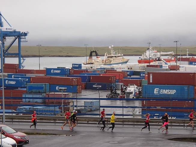 Sæbraut 10.09 Uhr / Km 16,5 Nach der Wende mit einer Steigung am Ende der Vatnagarđar ging es etwas erhöht auf der Sæbraut in der Gegenrichtung weiter. Dabei boten sich ab und an hübsche Blicke über den Hafen und die Läufer hinter mir. |