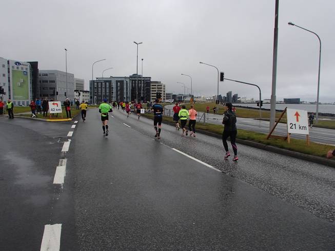 Sæbraut 10.21 Uhr / Km 18,5 Kurz danach kam dann die Teilung der Strecken. Die Halbmarathonläufer liefen geradeaus direkt auf das Ziel zu und die Marathonies liefen nach links auf einen größeren Bogen. |