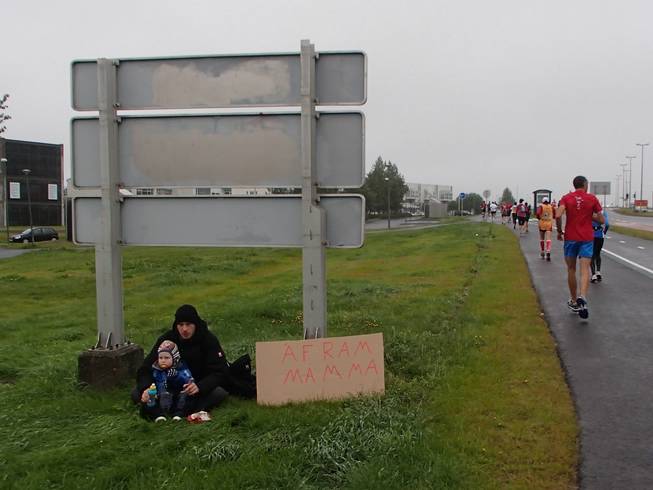 Sæbraut 9.49 Uhr / Km 12,8 Hier in der Ecke gab es auch mal mehr Zuschauer. Ausgerechnet hier, wo ich nicht damit gerechnet hätte. Aber egal. Und daß ich das Isländisch auf den Bannern und den Schildern nicht lesen konnte... auch egal. |
